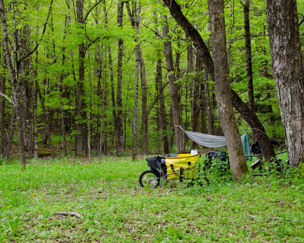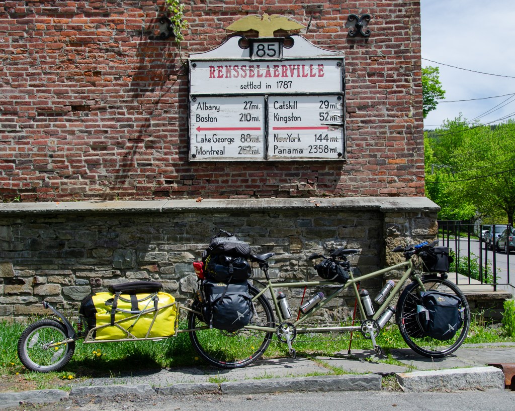 La première partie de l’état entre Albany et Oneonta a été assez difficile. Nous avions planifié le trajet afin de pouvoir longer le plus grand nombre de parcs d’état possible et de pouvoir y trouver plus facilement des endroits pour dormir en camping sauvage, autorisé dans ces parcs. Mais nous avons rapidement découvert que les parcs sont généralement situés au sommet des montagnes et qu’ils sont difficiles d’accès, voire même impossible d’y accéder avec un tandem chargé de 55 kg de bagages. Nous avons donc fait beaucoup plus de dénivelé que nécessaire et dormi en camping sauvage mais sur le terrain de particuliers. Les côtes dans cette première partie étaient d’ailleurs très abruptes, ce qui nous a forcé à descendre du vélo régulièrement pour le pousser.