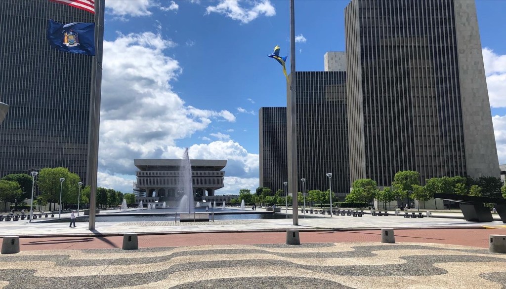 🇫🇷 Non, New York n’est pas seulement New York City. En fait, nous avons surtout roulé dans le nord de l’état, dans sa région plus montagneuse, plus boisée. Nous sommes entrés dans l’état de New York par la ville d’Albany, sa capitale qu’on ne connaissait que pour l’avoir croisée sur l’autoroute Montréal-New York. Mais jamais nous n’y étions allés. C’est donc avec surprise que nous avons découvert son centre administratif, l’Empire State Plaza avec son immense place, ses quatre tours à bureaux, son centre culturel et le musée. Tout cela situé à proximité du capitol, le siège du gouvernement. Puis nous avons découvert un joli quartier près du parc Washington, aussi dessiné par Frederick Law Olmsted, celui qui a dessiné le Central Park à New York et le parc du Mont-Royal à Montréal. Nous avons bien pu profiter de cette journée de repos. C’est aussi là que nous avons décidé de renvoyer un peu de matériel à la maison pour nous alléger un peu. Ce sera près de 3 kg de moins à transporter finalement.