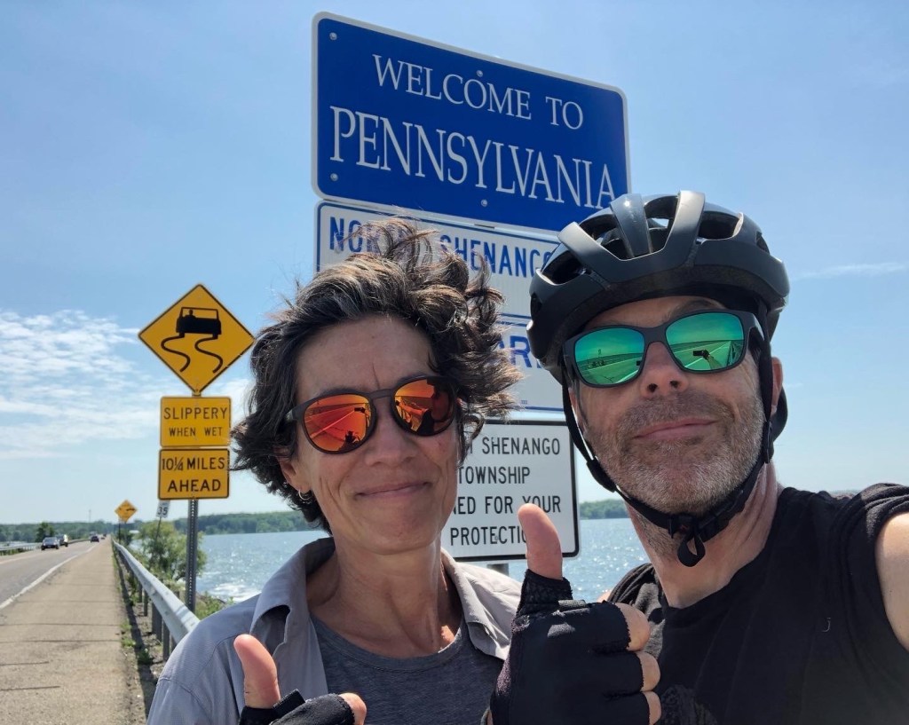 🇫🇷 Nous sommes entrés en Pennsylvanie sans vraiment s’en rendre compte. Nous avons emprunté une route secondaire pour quitter l’état de New York ce qui a fait en sorte qu’à la démarcation entre les deux états, il n’y a pas eu de panneau nous souhaitant la bienvenue. (Nous avons donc pris une photo d’un panneau de bienvenue en sortant de l’état). Mais c’est assez étrange de voir que rapidement, le relief a changé et que pour nous qui sommes sur la route, on peut presque dire où la démarcation s’est faite tellement l’impression sur la route est différente. Après les côtes new yorkaises très abruptes, la Pennsylvanie se déroule devant nous avec de jolis vallons assez faciles à traverser. Certains sont encore un peu pénibles mais en une semaine, il ne nous est arrivé qu’une seule fois de devoir descendre du vélo pour le pousser alors que dans l’état de New York, c’était souvent plusieurs fois par jours.