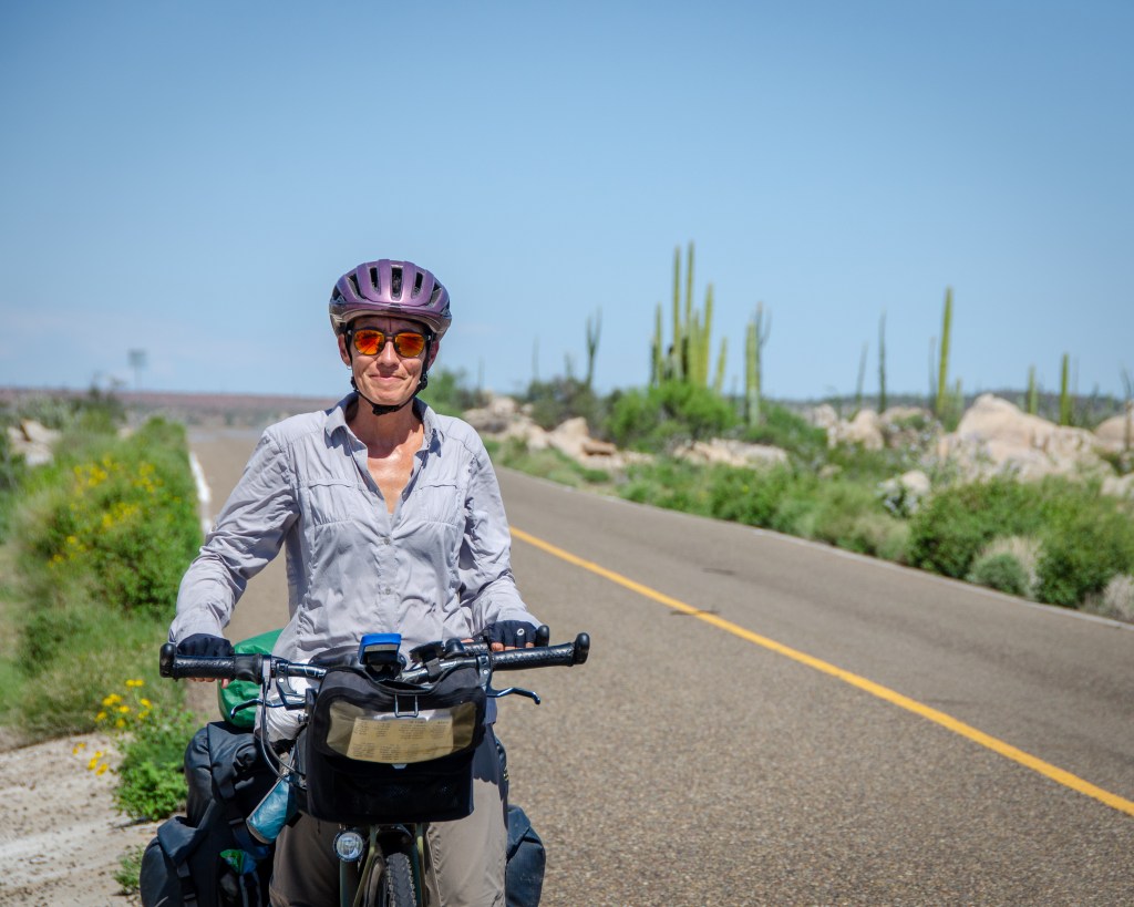 Petit à petit, on on se dirige vers le sud et quittons la région la plus touristique pour découvrir un territoire assez isolé aux terrains encore très arides. La route s’éloigne doucement de la côte et nous amène à traverser un désert aux paysages sublimes. Les cactus aux formes les plus diverses remplissent ces étendues vides. Les points de ravitaillement sont généralement distants d’environ 80 km les uns des autres et plus nous nous dirigeons vers le centre de la péninsule, plus  les températures montent. Nous devons encore affronter des chaleurs torrides avec un mercure dépassant souvent les 35 degrés. À nouveau, nous nous levons très tôt le matin pour parcourir le maximum de kilomètres avant les heures les plus chaudes. Presque tous les jours, nous remettons en question notre choix de continuer à rouler dans ces conditions. Tous les jours, nous considérons nous arrêter pour rejoindre La Paz en bus.
