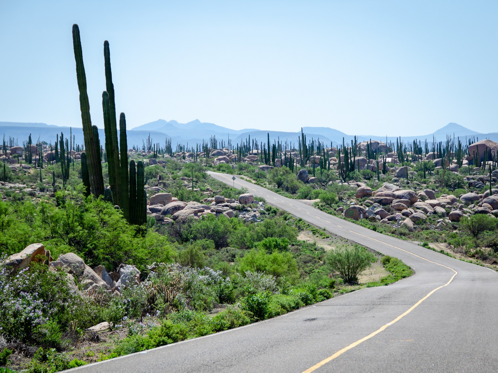 Petit à petit, on on se dirige vers le sud et quittons la région la plus touristique pour découvrir un territoire assez isolé aux terrains encore très arides. La route s’éloigne doucement de la côte et nous amène à traverser un désert aux paysages sublimes. Les cactus aux formes les plus diverses remplissent ces étendues vides. Les points de ravitaillement sont généralement distants d’environ 80 km les uns des autres et plus nous nous dirigeons vers le centre de la péninsule, plus  les températures montent. Nous devons encore affronter des chaleurs torrides avec un mercure dépassant souvent les 35 degrés. À nouveau, nous nous levons très tôt le matin pour parcourir le maximum de kilomètres avant les heures les plus chaudes. Presque tous les jours, nous remettons en question notre choix de continuer à rouler dans ces conditions. Tous les jours, nous considérons nous arrêter pour rejoindre La Paz en bus.